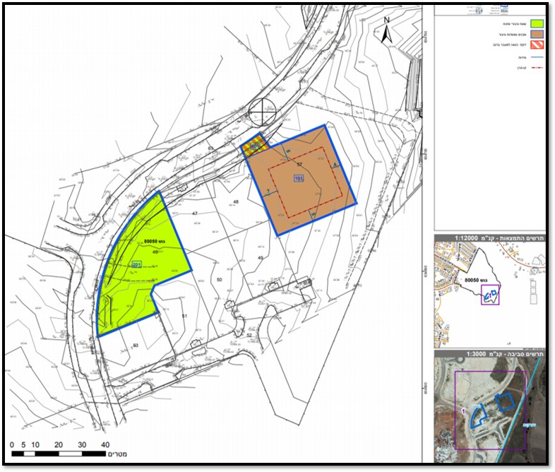 ההצרחה. השטחים המדוברים בחלק המזרחי של גדרה מזרח. בחום – השטח המיועד לקן של נועת הנוער מכבי