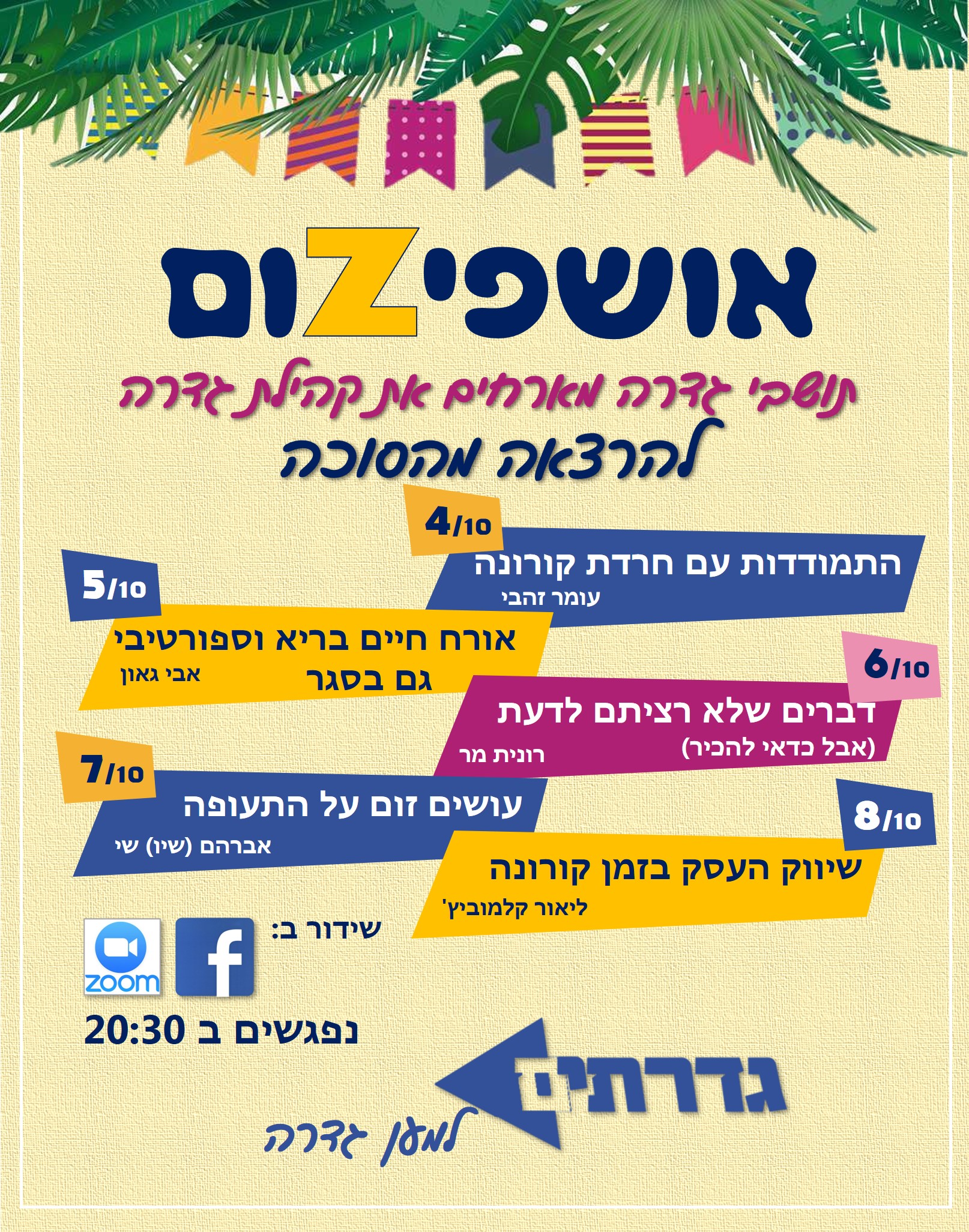 בתנועת הגדרתים מצאו פתרון יצרתי לחגיגת סוכות במהלך הסגר – בתנועה מפיקים סדרת הרצאות של תושבי גדרה בתחומי עניין שונים שישודרו מסוכות המרצים היישר אל קהל המתעניינים דרך הרשתות החברתיות ואפליקציית הזום.