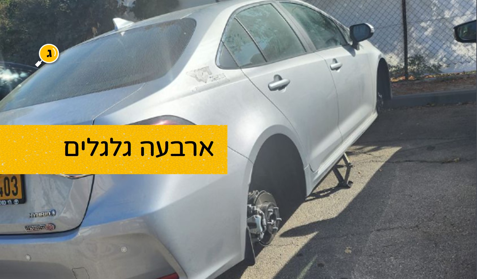 ארבעה גלגלים. באישון לילה, בעיצומה של מלחמה, בלב המושבה, אירוע גניבה חריג של ארבעה גלגלים מרכב פרטי בשכונת גבעת אביב התרחש בליל שבת: