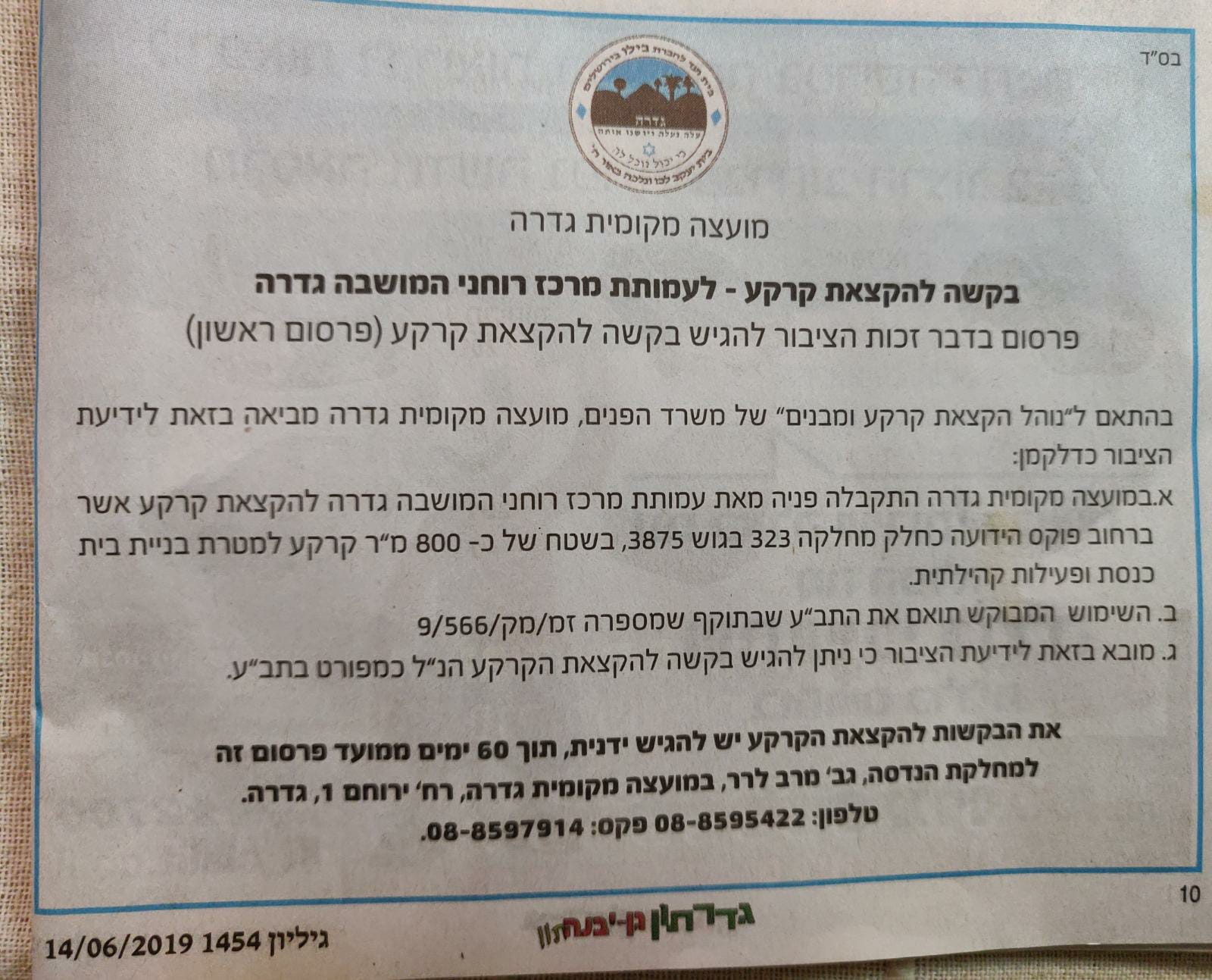 הפרסום נעשה על רקע פנייתה של עמותת מרכז רוחני המושבה גדרה, עמותה הקשורה לחב”ד, להקצות את הקרקע, בשטח של 800 מ”ר לבניית בית כנסת במקום.