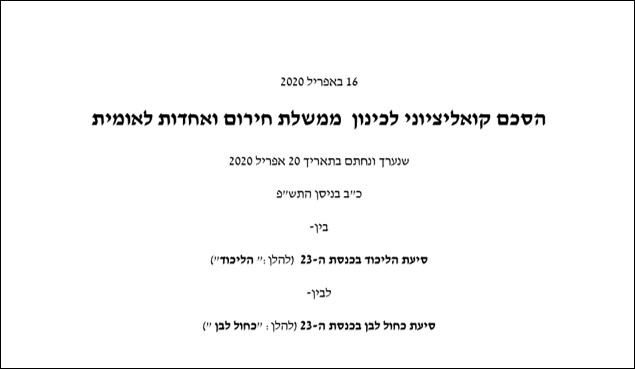 “הואיל ומדינת ישראל נקלעה למשבר היסטורי עקב התפשטות נגיף הקורונה ועקב המשבר החברתי, הרפואי והכלכלי שנובע ממנו…” כך נפתח ההסכם הקואליציוני בין מפלגת הליכוד למפלגת כחול לבן שהביא לסיומו את המשבר הפוליטי הארוך והעמוק ביותר שידעה המדינה.