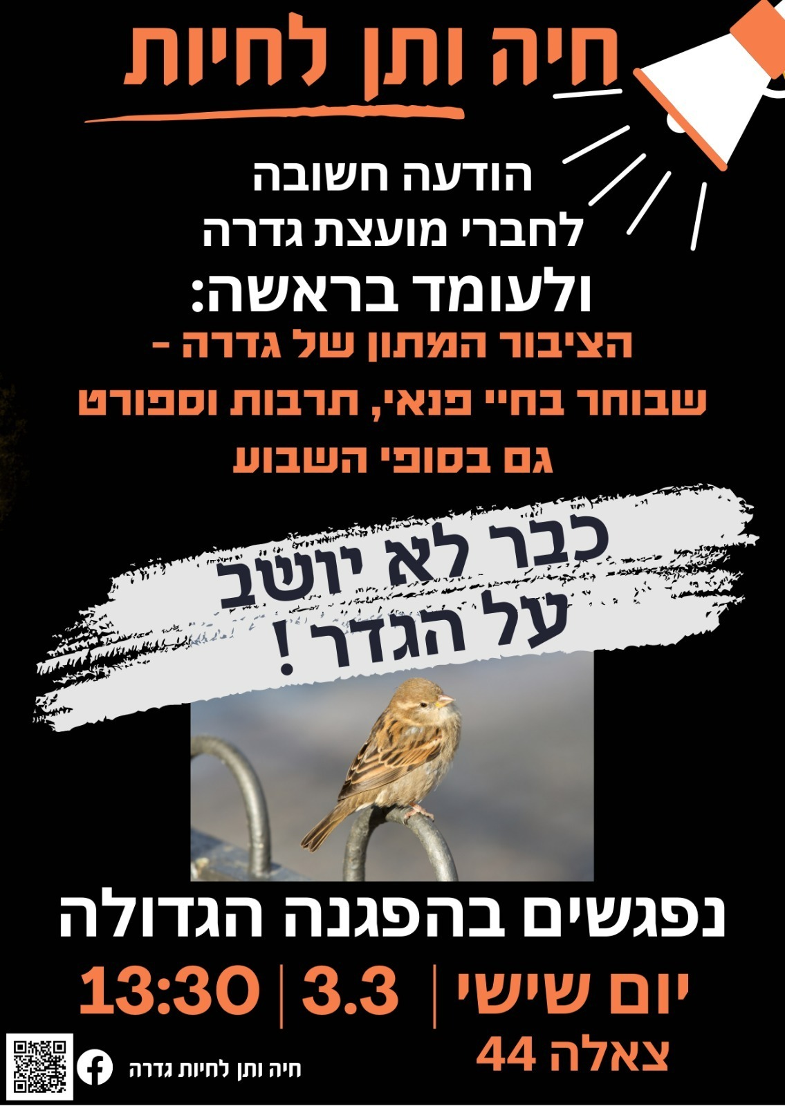 הפגן ותן לחיות. המאבק על צביונה של המושבה גדרה נמשך ומגיע לרגע שיא עת קבוצת התושבים ‘חיה ותן לחיות’ תוביל את הפגנת תשבי גדרה שתתקיים מחר בצהריים בשכונת גולדה מאיר.