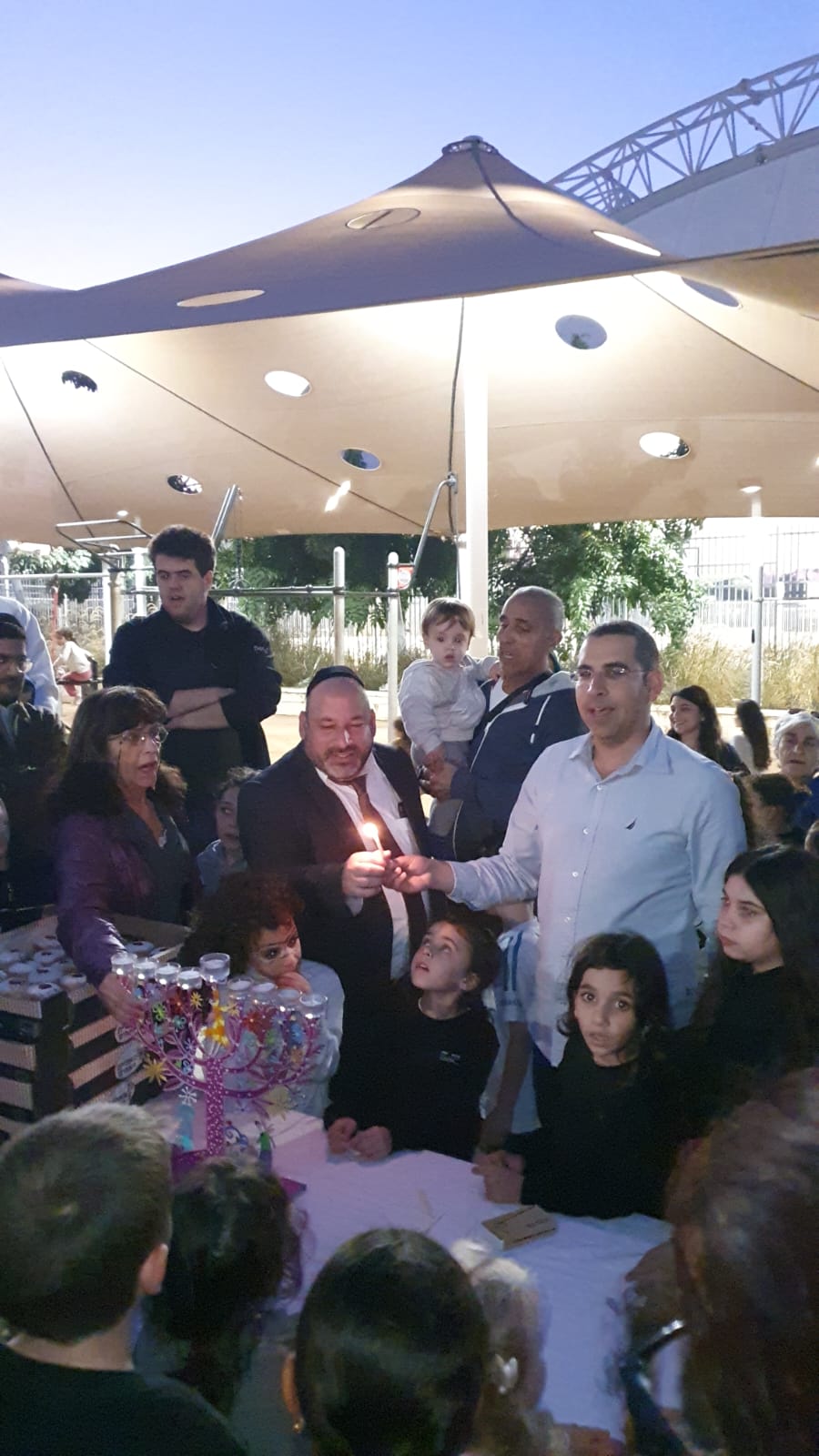 חנוכה שמח. מדליקים ביחד. חברי המועצה סהר פינטו ושלום אזרד במעמד הדלקת נר שמיני של חנוכה בספורטק