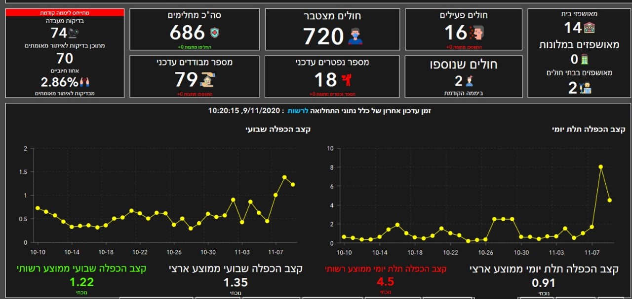 18 נפטרים, מקדם הכפלה 1.22. DashBoard נתוני הקורונה המקומי (הנתונים נכונים ל 9/11/20)