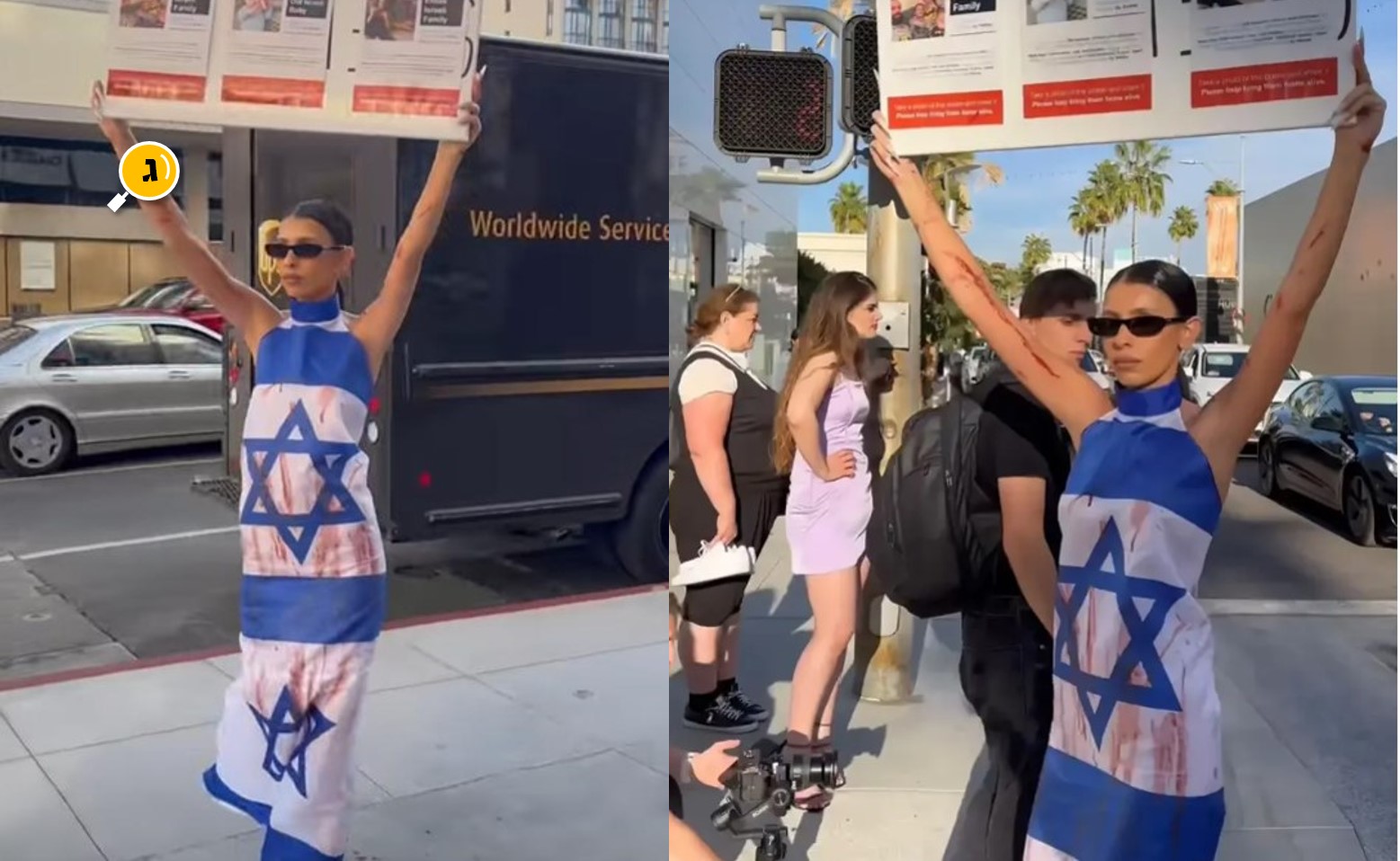 לינוי עבודי עם המחשה מדממת למצב החטופים ברחובות לוס אנג'לס לינוי עבודי, אחותה של קרן עבודי מגדרה, דוגמנית המתגוררת בלוס…